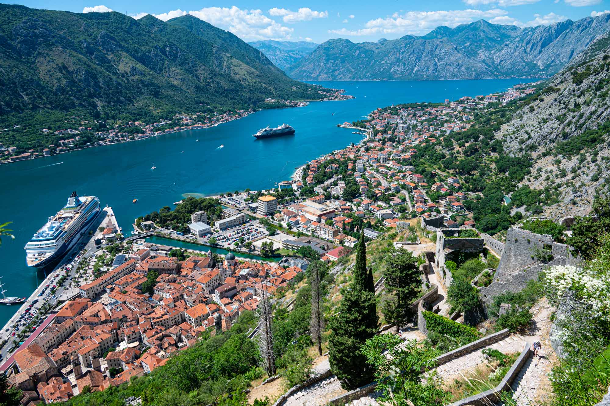 There are two paths you can take to hike up to the fortress. One entrance is at the back of Old Town and the other starts at the base of the mountains northeast of Old Town. The other path starting directly from Old Town is not as long, but steeper and you are charged admission. The Ladder of Kotor is a series of switchbacks, which takes longer, but isn’t as steep. Both paths take you to the fortress, but you can also follow the Ladder of Kotor further up the mountain for an even higher view of the fortress, Old Town, and the bay.